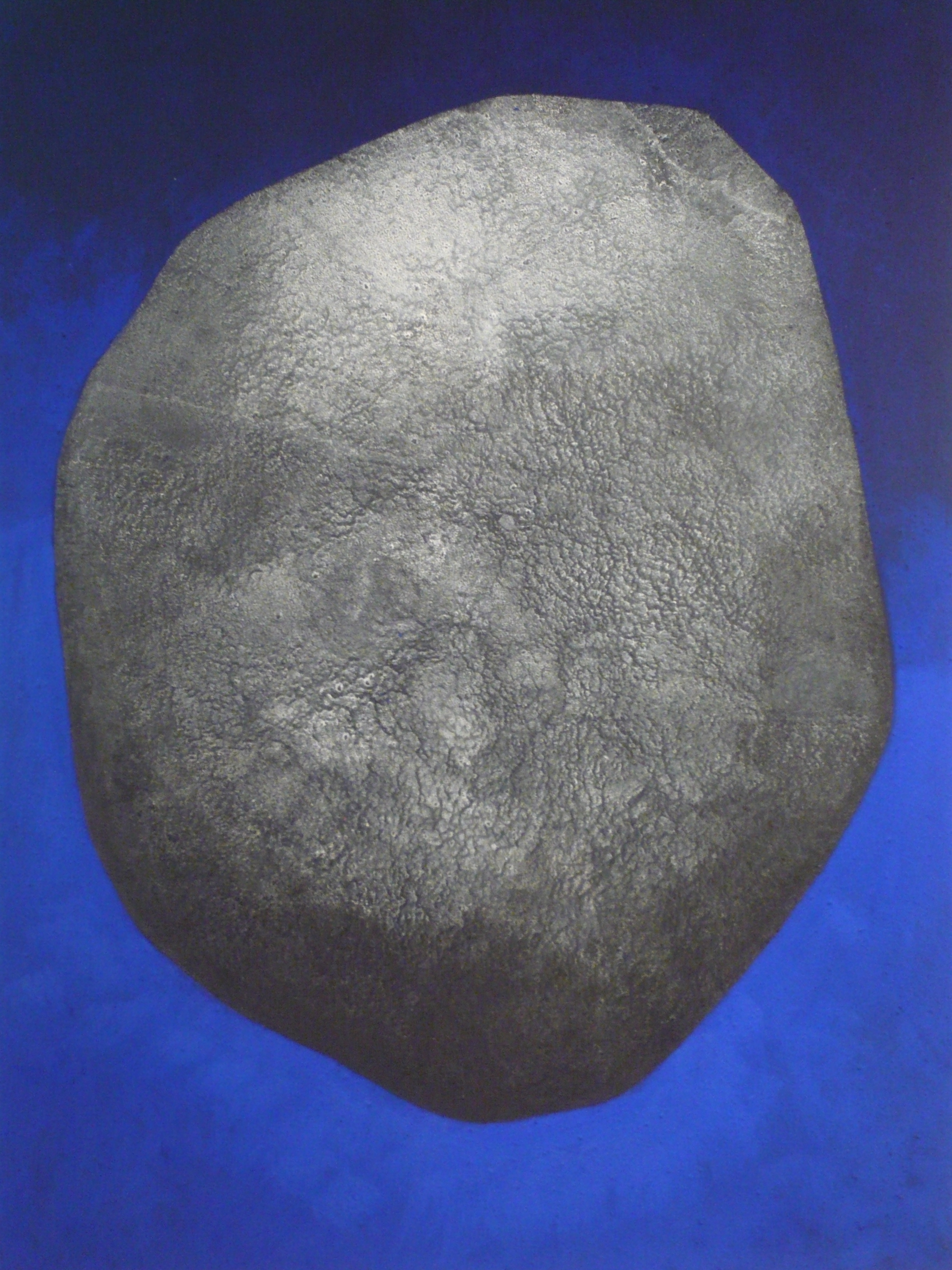Une série nouvelle advient. Ici, la grammaire du peintre se mobilise dans l’élaboration d’une palette abrupte et construit une rhétorique des contraires qui se frottent avec une rare violence. L’étendue bleue au comble de sa saturation s’oppose à l’enveloppe délicatement grise des comètes. Paradoxalement elle repousse autant qu’elle donne corps. Les glacis transparents finement nuancés provoquent l’espace opaque dont les zones noircies obligent à l’éclat la lumière des roches. Contre-jour, scintillement des lisières, miroitement des facettes, autant de manifestations d’une lumière sans source qui transforment ces amas en lanternes sans poids. Va et vient de lucioles qui, à la moindre halte, enluminent les lieux.